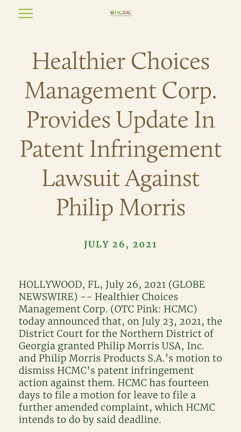 . Rooms Rankings Earnings Newsletters. Healthier Choices Management Corp HCMC is a US-based publicly-traded company specializing in providing consumers with healthier alternatives to everyday. I have almost 1mil shares and will sell at least 200k if it hits 10.